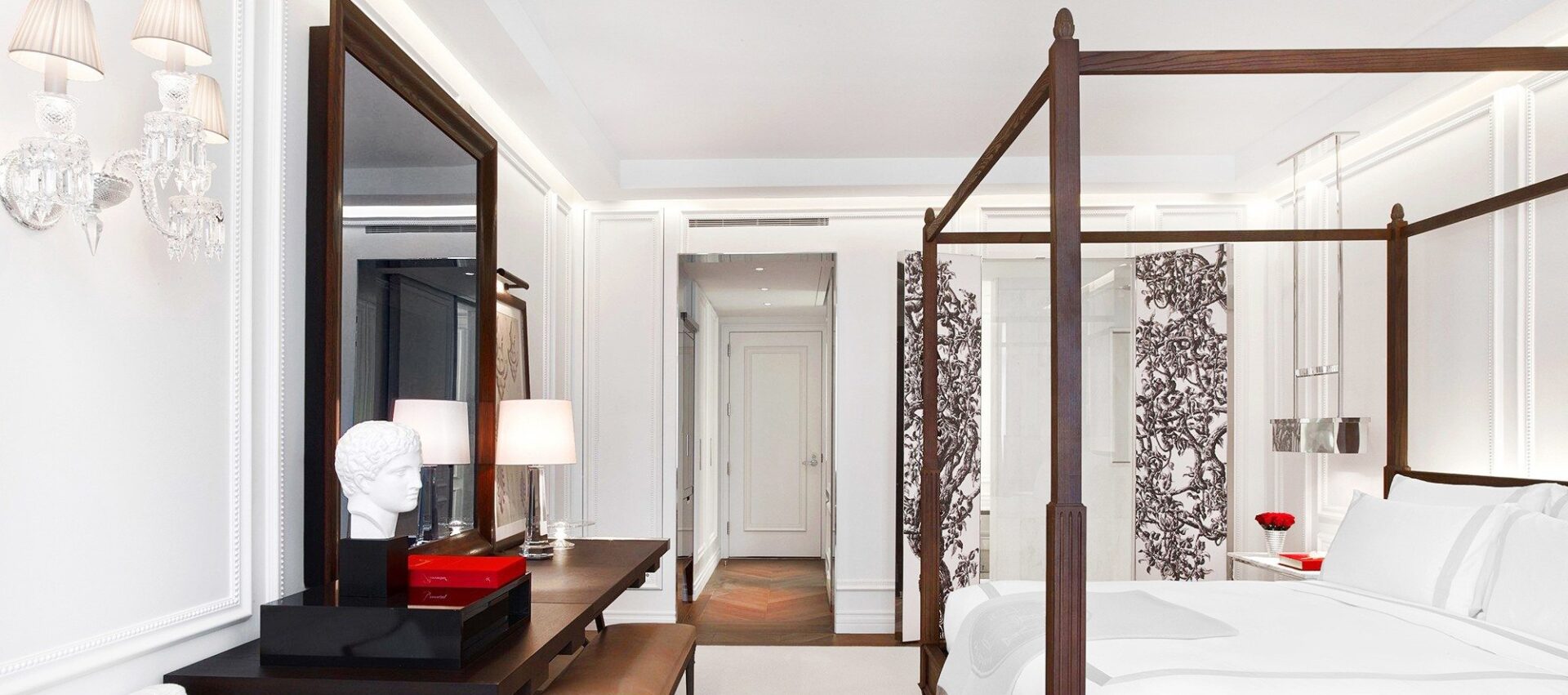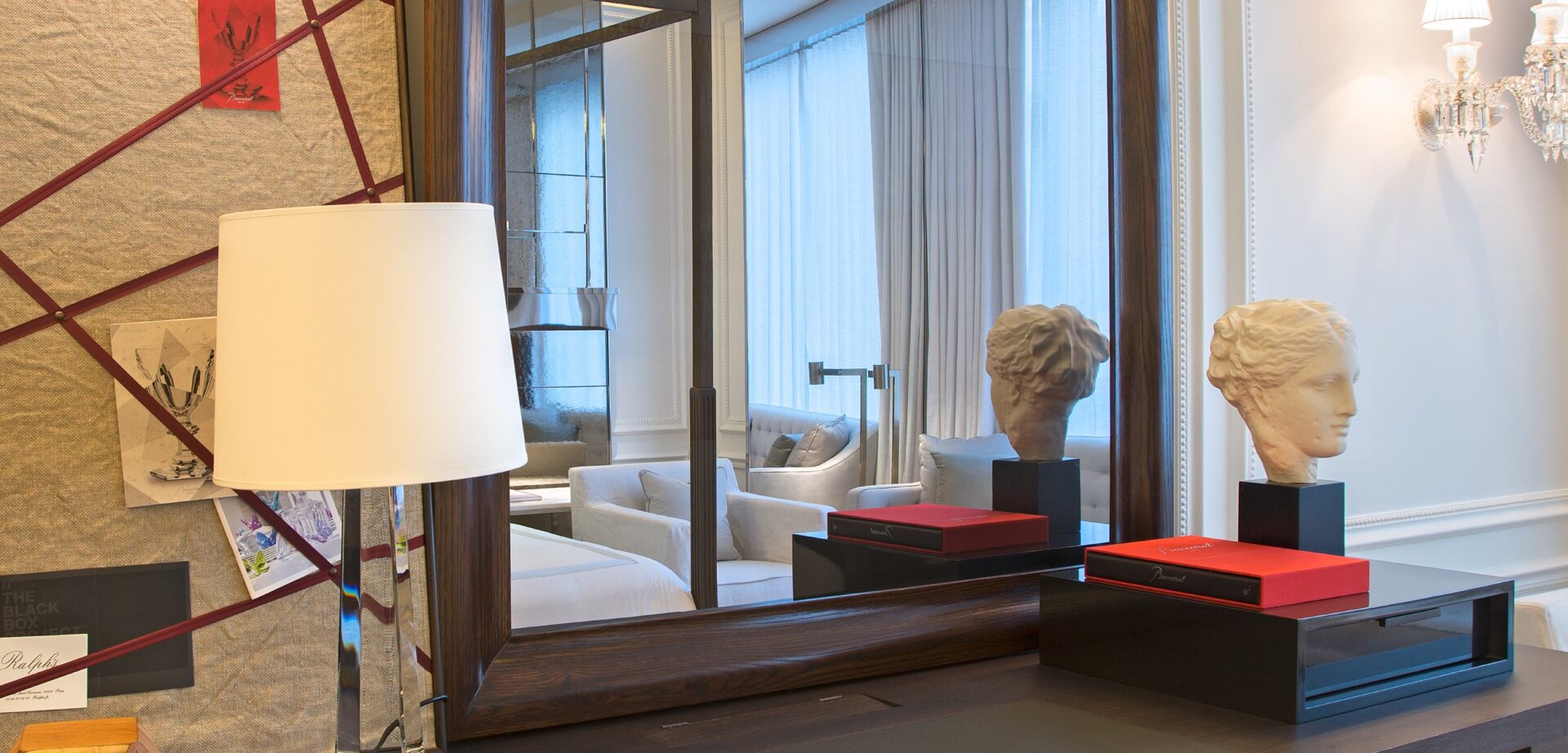 Baccarat Hotel Bedroom with Mirror TV in custom mahogany wooden frame